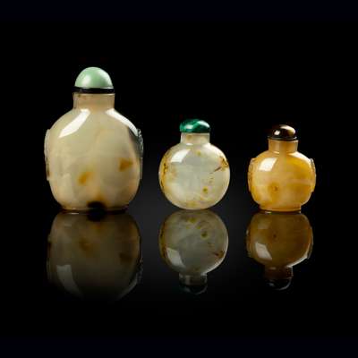 comprising: one honey agate snuff bottle with lion-mask handles; one cloud agate snuff bottle; and one large shadow agate snuff bottle with lion-mask handles; all with stopper (3)