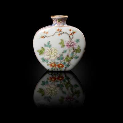 of flattened form, painted on each main side with a convex panel, one with a garden scene with blossoming peonies and small chrysanthemums, the other with a poem by the Qianlong emperor appreciating peonies in regular script, followed by ‘Qian’ and ‘Long’ in red seals, the narrow sides with stylised pattern on pink enamel ground, the base inscribed with a four-character Qianlong mark in iron-red