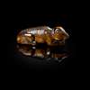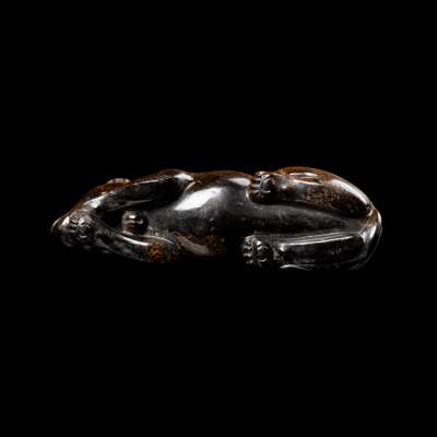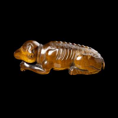 carved as a slender recumbent dog with its head slightly raised to right above two front legs, ears tucked down, tail coiling on rear hind, its body carved in relief with bushy fur flanking the protruding spine and ribs, a bell tied to its neck by a cord, the stone of classic golden to red-brown colour and silky lustre