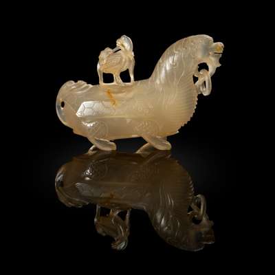 Two closely comparable vessels of the same dragon-head tortoise and crane design, both carved with the same four-character mark: one made of rock crystal, was in The Fryers Collection, sold at Christie's London, 18 May 2012, lot 1121; the other of agate in a private French collection, sold at Christie's Paris, 8 Dec 2021, lot 252.