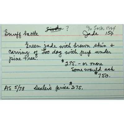 For a discussion of the Master of the Rocks School of carving, see H. Moss, V. Graham, K.B. Tsang, A Treasury of Chinese Snuff Bottles: The Mary and George Bloch Collection, Hong Kong, 1995, vol. 1, Jade, nos. 133-43.