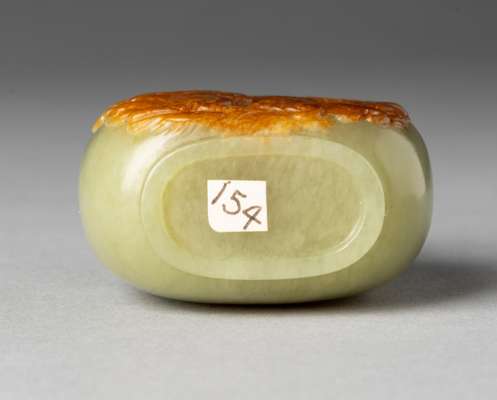 The present snuff bottle can be compared to a number of examples produced by the Master of the Rocks School which appears to have specialised in jade carvings from this distinctive material of yellow-chestnut stone with russet skin. For examples of 'Master of the Rocks' russet and yellow jade snuff bottles, see: one carved with 'Noble Occupations' theme from the Mary and George Bloch Collection, was sold at Bonhams Hong Kong, 23 November 2010, lot 122; and another 'figures in landscape' snuff bottle from the same collection was sold at Sotheby's Hong Kong, 26 November 2013, lot 74; and a further comparable example carved with female immortal and monkey from the Francine and Bernard Wald Collection, was sold at Bonhams New York, 17 March 2025, lot 215.