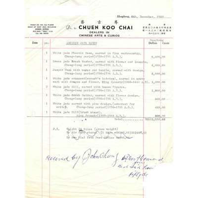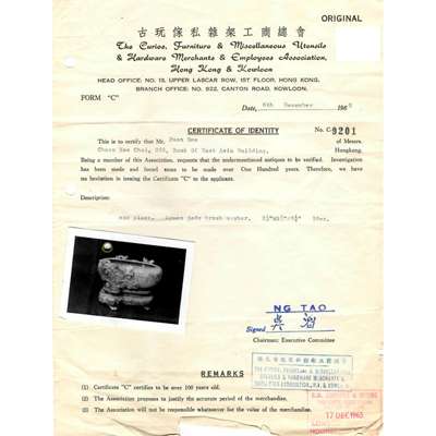 前倫敦私人收藏;購自香港尊古齋,1963年12月4日,含收據;亦含古玩傢私雜架工商協會頒證書一份,1963年12月6日。