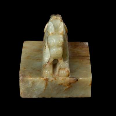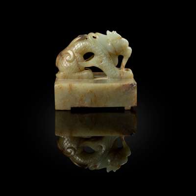 A square seal from the Yuan dynasty similarly carved with a dragon on the top was included in the exhibition Chinese Jade Throughout the Ages, jointly organised by The Arts Council of Great Britain and The Oriental Ceramic Society, 1 May - 22 June 1975, Victoria & Albert Museum, no. 341. Two comparable jade ‘dragon’ square seals were sold at Christie's London: one dated to the Yuan dynasty 13th/14th century, sold on 14 May 2013, lot 129, whilst the other dated to the Qing dynasty and of Yuan-style, was sold on 4 Nov 2014, lot 77.
