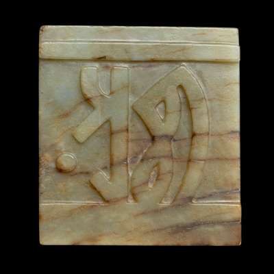 清 元代風格青玉帶沁梵文麒麟鈕方印
