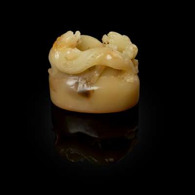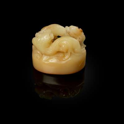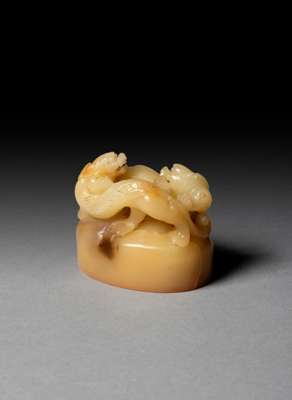 of oval form, surmounted by two ferocious dragon chasing each other, carved in meticulous precision with bulging eyes and flaring nostrils above open mouth revealing sharp teeth, the scaly coiled body depicted in dynamic motion, the flowing mane finely incised with its long tail coiled at the rear, the seal face deeply and crisply worked with the characters reading Le An He ('happiness in peace and harmony'), the stone of a creamy yellow colour flecked with brown spots