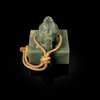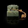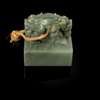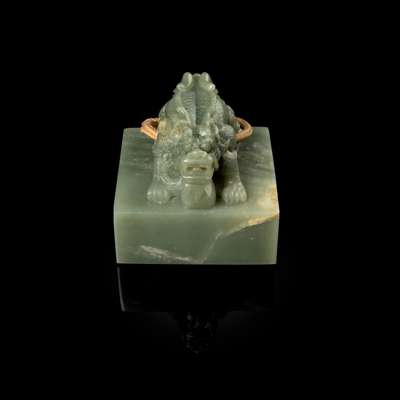 of large square form, surmounted by a superbly articulated pair of dragons, each powerfully depicted with eyes bulging and nostrils flaring above curling whiskers and jaws bearing sharp fangs, the scales and flowing mane meticulously incised, the two scaly bodies tightly intertwined and crouching on the haunches, pierced through the centre with an aperture, the seal face uncarved, the stone of a deep forest-green tone with natural veining