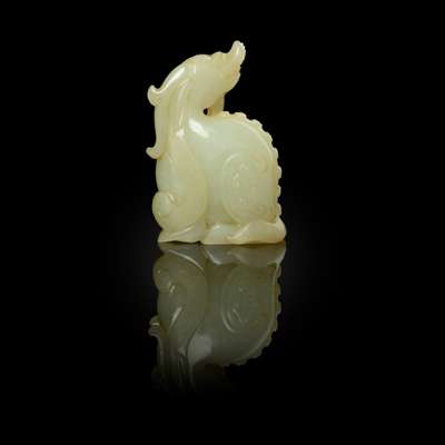 CHINESE WHITE JADE WITH RUSSET SKIN CARVING OF A MYTHICAL ANIMAL, TIANLU