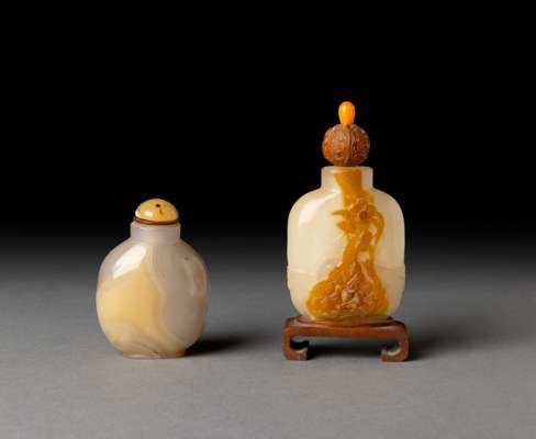 [COLLECTION OF PROF. J. GILBERT & CORA MCALLISTER] TWO CHINESE CHALCEDONY AGATE SNUFF BOTTLES