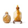 one rounded snuff bottle carved on one side with a boy and tree, the reverse plain; the other oblong snuff bottle carved on one side with a scholar sitting under a large pine tree with a gourd hanging above, the reverse with two further figures, with a wooden stand; both with stopper (2)