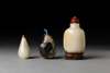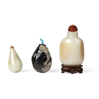 comprising: one tear-shaped white jade snuff bottle with plain sides; one pebble white and black jade snuff bottle with naturalistic irregular sides; and one white jade with russet skin snuff bottle with triangular form and plain sides, with stand; all with stopper (3)