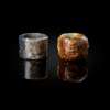 one pale green and russet jade thumb ring, carved with four animal-mask handles; and one black and grey ring with plain sides (2)