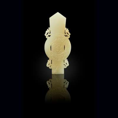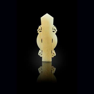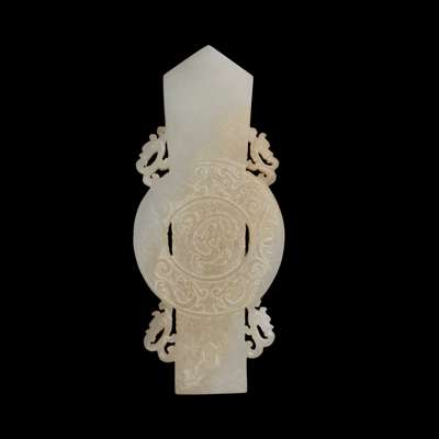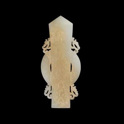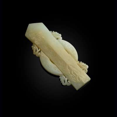 the design composed of a circular disc-shaped bi and a long arrow-end hu tablet, carved with the Big Dipper seven stars above rockwork in crushing waves, the reversed with a chi-dragon surrounded by further four on the bi, four corners carved reticulately with four stylised dragon heads, the white stone with russet patches