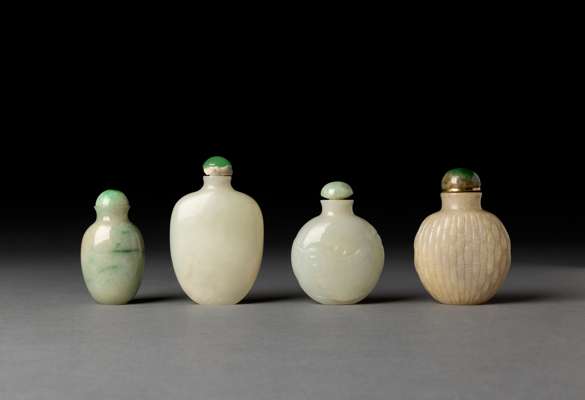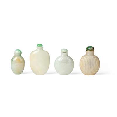 comprising: one ovoid jadeite snuff bottle of plain form; one oblong white jade snuff bottle of plain form; one rounded pale celadon jade snuff bottle carved in relief with a wing-spreading large crane; and one creamy white jade snuff bottle carved with rattan pattern all around; all with stopper (4)