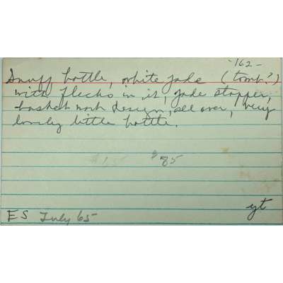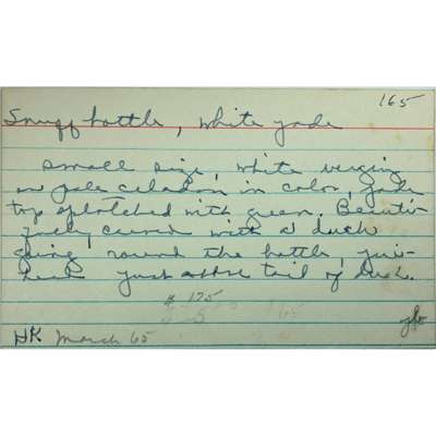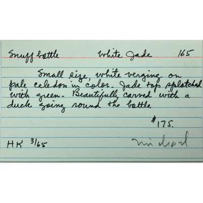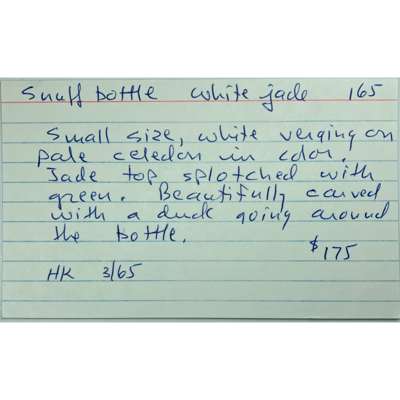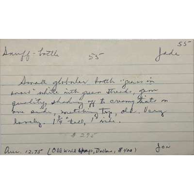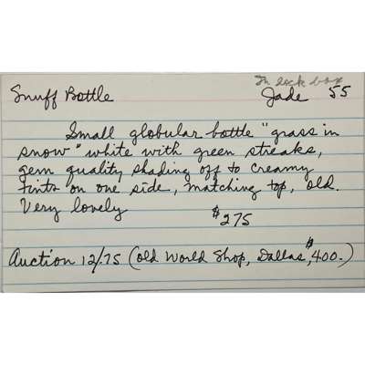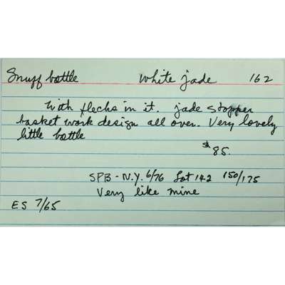 Collection of Prof. J. Gilbert & Cora McAllister, thence by descent based in England. With collector's handwritten note and Collector's Number 55, 162 and 165. The jadeite snuff bottle (55) acquired in 1975 from the Old World Shop in Dallas; the 'rattan' snuff bottle (162) acquired in Hong Kong in July 1965, via “ES”; the ‘crane’ one (165) acquired in March 1965 from or via “HK”.