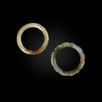 each of circular form, one of plain sides and the white stone with russet inclusions; the other celadon jade bagel with russet inclusions carved on the exterior in relief with twelve Chinese zodiac (2)