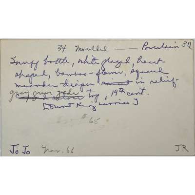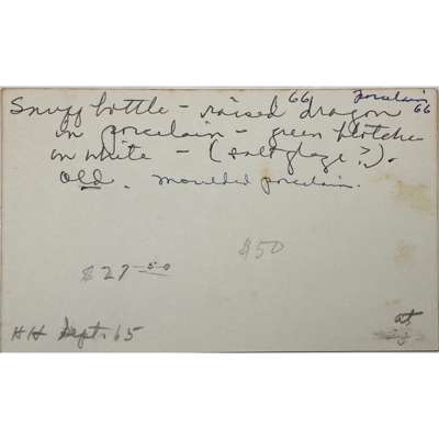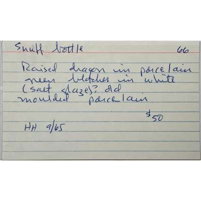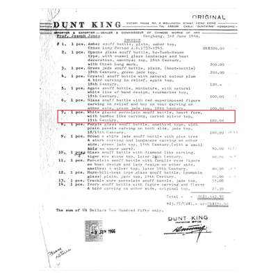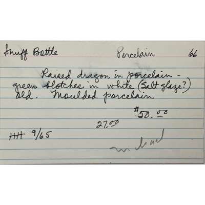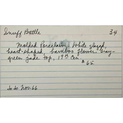 Collection of Prof. J. Gilbert & Cora McAllister, thence by descent based in England. With collector's handwritten note and Collector's Number 34 and 66. The heart-shaped one (34) acquired from Dunt King in Hong Kong via Joseph Jones in 1966, with original invoice issued on 3rd June 1966, listed as “([no.]7, 1 pce. White glazed porcelain snuff bottle, heart form, with bamboo like carving, carved silver top, 19th century, [HK$] 100.00”. Together with Joseph Jones' hand-drawing of the snuff bottle and a letter to Gilbert & Cora on the University of Hong Kong, Department of English titled paper on 7th June 1966.