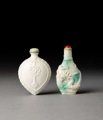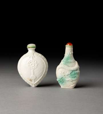 one white-glazed heart-shaped snuff bottle moulded in low to mid relief on both sides with a string of flower heads under a shou longevity character against key-fret ground; the other green-splashed white enamelled pear-shaped snuff bottle moulded in high relief with a large scaly dragon with carved details and bulging eyes highlighted in black enamel, amidst clouds above waves; both with stopper (2)