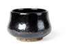 thickly potted, the rounded body supported on a short foot and terminated to slightly narrower straight sides, covered inside and out with a blackish-brown glaze suffused with silvery 'oil spots' falls in a thick line above the foot, the foot ring unglazed revealing the buff stoneware body