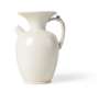 the ovoid body rising from a gently tapering foot, the narrow spout set on the shoulder opposite the handle formed from three strands of clay tied together towards the flaring neck, the body covered with a white slip and a creamy glaze stopping above the foot