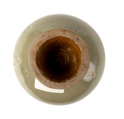 the rounded body supported on a tall splayed foot with three raised bands, surmounted with long neck further adorned with raised bands, gradually terminated to a foliated mouth, the exterior covered in an olive-green celadon glaze with a yellowish hue, leaving the foot unglazed revealing the brownish grey body