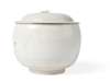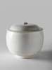 potted with upright sides, supported on short foot, the slightly domed cover with finial, all covered in a creamy-white glaze stopping irregularly at the lower body