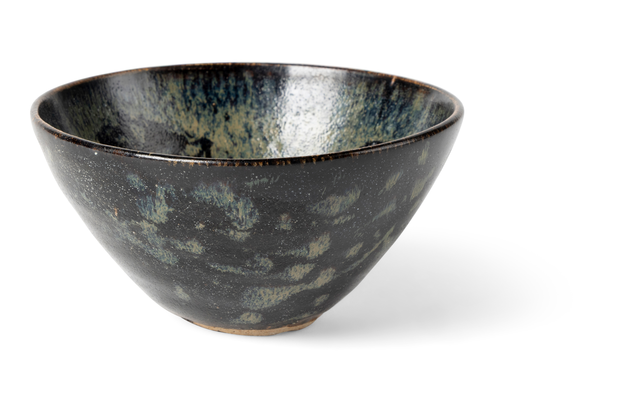 the rounded conical body resist-decorated on the interior with three rectangular motifs, all reserved in black against the variegated, milky beige and blue ground, the exterior covered in a 'tortoiseshell' glaze of dark brown colour mottled in beige and blue colour that falls irregularly to the foot