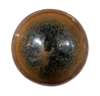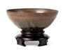 sturdily potted with a shallow groove below the mouth rim, applied with a black glaze with brown 'hare's fur' streaks stopping irregularly above the foot, revealing unglazed dark brown stoneware body, with a fitting wooden stand