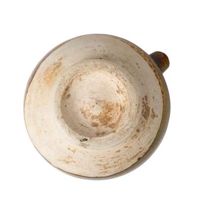 of compressed globular form supported on spreading foot, with short cylindrical tapering spout, covered overall with an amber to brownish-green-glaze stopping around the belly, revealing the buff pottery body