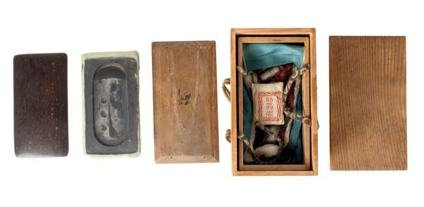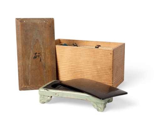 the inkstone supported on four ruyi-head cloud feet at the corners, the top has an oval, textured grinding surface, and a semi-circle well at one end, with a wooden cover and wooden box tomobako, the cover of the box inscribed with ‘Yen’ (grind)