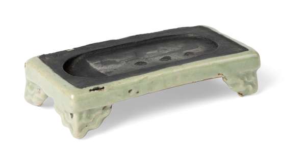 A celadon-glazed octagonal ink stone stands on eight feet decorated with ‘Eight Trigrams’, incised and dated 洪武五年 (Hongwu wu nian, ‘Fifth year of Hongwu’ [AD 1372]), is in the Percival David collection, British Museum, museum registration no: PDF.261. Two further Longquan celadon-glazed inkstones: one dated to the Ming dynasty was in the Sakamoto Family Collection, Japan and sold at Christie's New York, 14 Sep 2012, lot 1411; the other dated to the Yuan dynasty was offered at Sotheby's Hong Kong, 19 March 2024, lot 178.