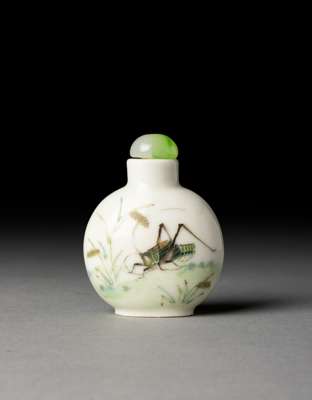The appearance of grasshoppers or katydids became a popular subject matter for decorations on snuff bottles during the late Qianlong period, mostly seen on the enamelled-glass wares which bear guyuexuan marks. However, it was during the Daoguang period when the design permeated into the Imperial court as a favoured subject. The popularity of the design is also considered a by-product of the fashion for selecting and breeding the finest fighting crickets in the Daoguang period. Compare a snuff bottle of similar design from the Mary and George Bloch collection, illustrated in Moss, Graham and Tsang, A Treasury of Chinese Snuff Bottles: The Mary and George Bloch Collection, Vol.6, Arts of the Fire, Hong Kong, 2008, pp.690-691, no.1318, sold at Bonhams Hong Kong, 28 November 2011, lot 164. Another example from The Paul Braga Collection was sold at the same saleroom, 24 November 2012, lot 96.