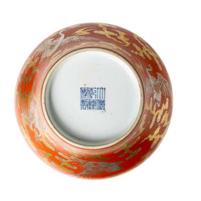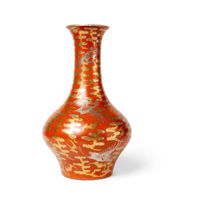 CHINESE CORAL-RED-GROUND GILT AND SILVER-DECORATED 'CRANE AND BAT' VASE