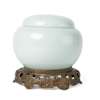 of rounded form, applied overall with a white glaze with a tinge of pale celadon colour, the underside of the cover inscribed with a six-character Qianlong mark in underglaze blue, on a bronze stand