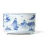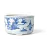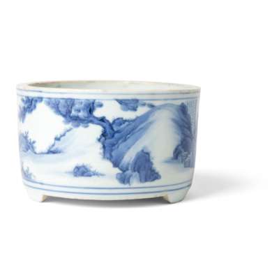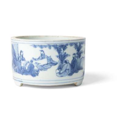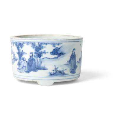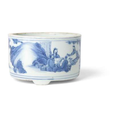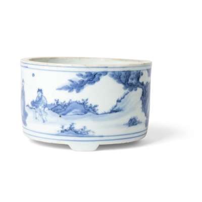 Also compare to a very rare blue and white tripod incense burner, tonglu, painted with Luohan, Ming dynasty, Chongzhen period, sold at Bonhams London, 10 November 2016, lot 30; See a comparable ‘drunken scholar’ tonglu, Ming dynasty, Chongzhen period, sold in this saleroom, 4 November 2022, lot 155.