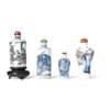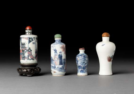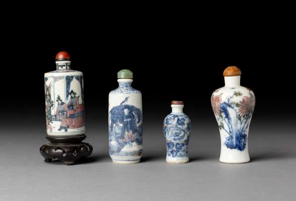 comprising: one cylindrical form painted with a court scene including a seated officer behind desk, with wooden stand; one cylindrical form painted with a high-ranked officer and his attendant visiting a hermit dressed as a farmer, accompanied by an elephant and bird, the base painted with tendril pattern; one small baluster form decorated with various flowers; and one larger baluster form painted with blossoming chrysanthemums issuing from rockwork; all with stopper (4)