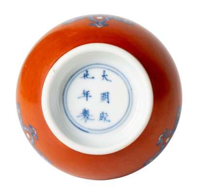 清 成化款 礬紅地青花番蓮紋蒜頭瓶