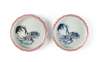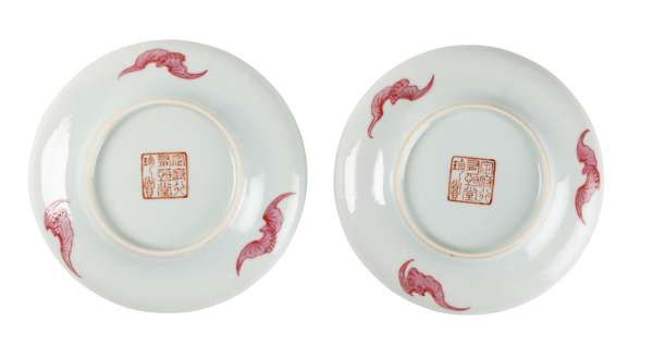 each of compressed form, painted in the interior with two crabs and aquatic plants, outer mouth rim with a ruyi shoulder band, the base inscribed with an eight-character ‘Dingfu Xingyouhengtang zhenshang’ (installed in the [Prince's] official residence, the Hall of Constancy, to be treasured and enjoyed) mark in iron-red (2)