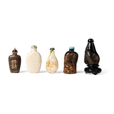 comprising: one buffalo horn snuff bottle with a bone-carved ‘double happiness’ character attached to one side, the reverse incised with landscape and inscriptions; one oblong snuff bottle carved with stylistic flower pattern on both sides, possible made of white coral; one mother-of-pearl snuff bottle of pear shape, one side carved in high relief with a peach on leaf with natural grooves, the reverse plain; and two snuff bottles possibly made of root amber, respectively carved with rabbit and peacock, one with wooden stand; all with stopper (5)