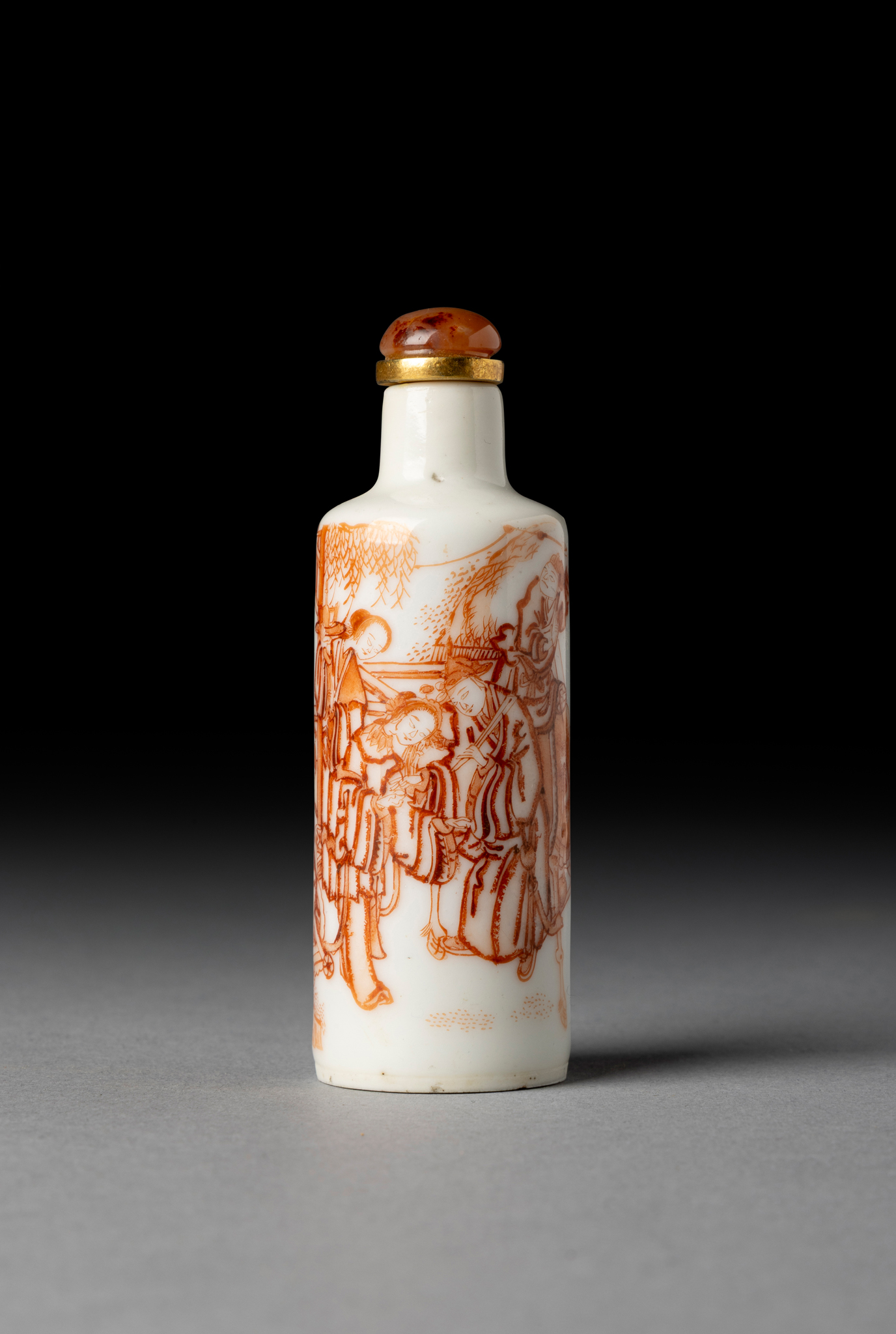 [COLLECTION OF PROF. J. GILBERT & CORA MCALLISTER] CHINESE IRON-RED-DECORATED 'ROMANCE OF THE WESTERN CHAMBER' SNUFF BOTTLE
