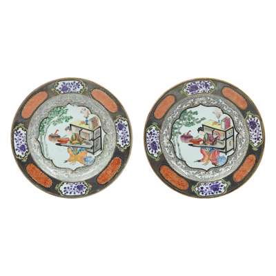 each finely painted with a lady playing a musical instrument qin beside a tree in a central quatrefoil panel, within a floral scroll on a trellis ground in the well, and blue enamel floral cartouches alternating with iron-red and gilt cartouches reserved on a silvered band at the border (2)