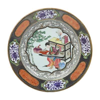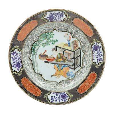 Compare to an identical dish in the British Museum, museum no. Franks.418; also a larger example exhibited in Chinese Export Porcelain, Marchant & Son, London, 2015, cat. no. 11; Similar to the above, a pair (38.5cm diameter) sold at Sotheby's Paris, 14 June 2024, lot 130, another (35.4cm diameter) sold at Christie's London, 2 Jul 2013, lot 338.