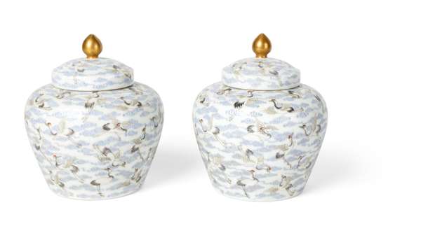 民國 乾隆款 粉彩祥雲百鶴紋蓋罐(一對)