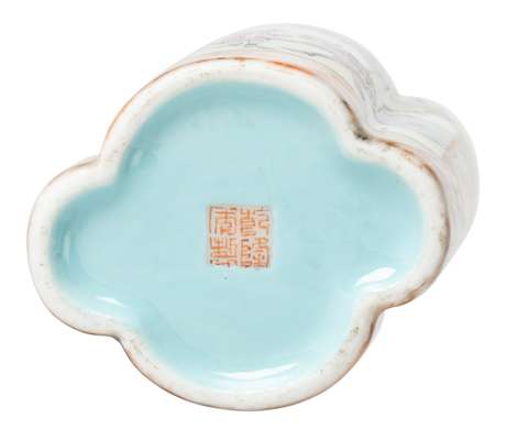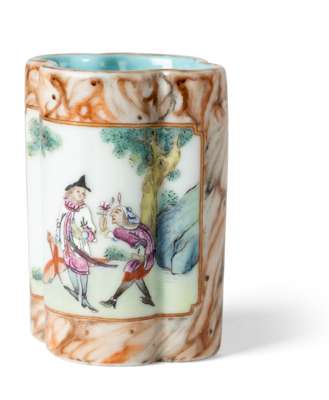 清乾隆款及年代 粉彩開光仿木紋釉地西洋人物紋海棠型筆插