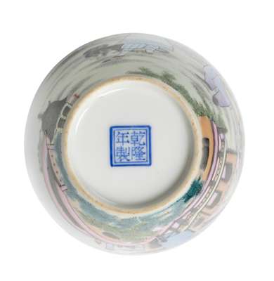 painted with two European figures in a Western setting, the base inscribed with a four-character Qianlong mark within a double-square in blue enamel