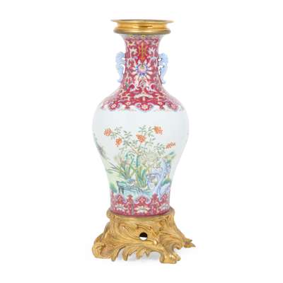 painted with three rams with a sun in a garden, the base inscribed with a six-character Jiaqing mark in iron-red, gilt-bronze mounts at the mouth and foot