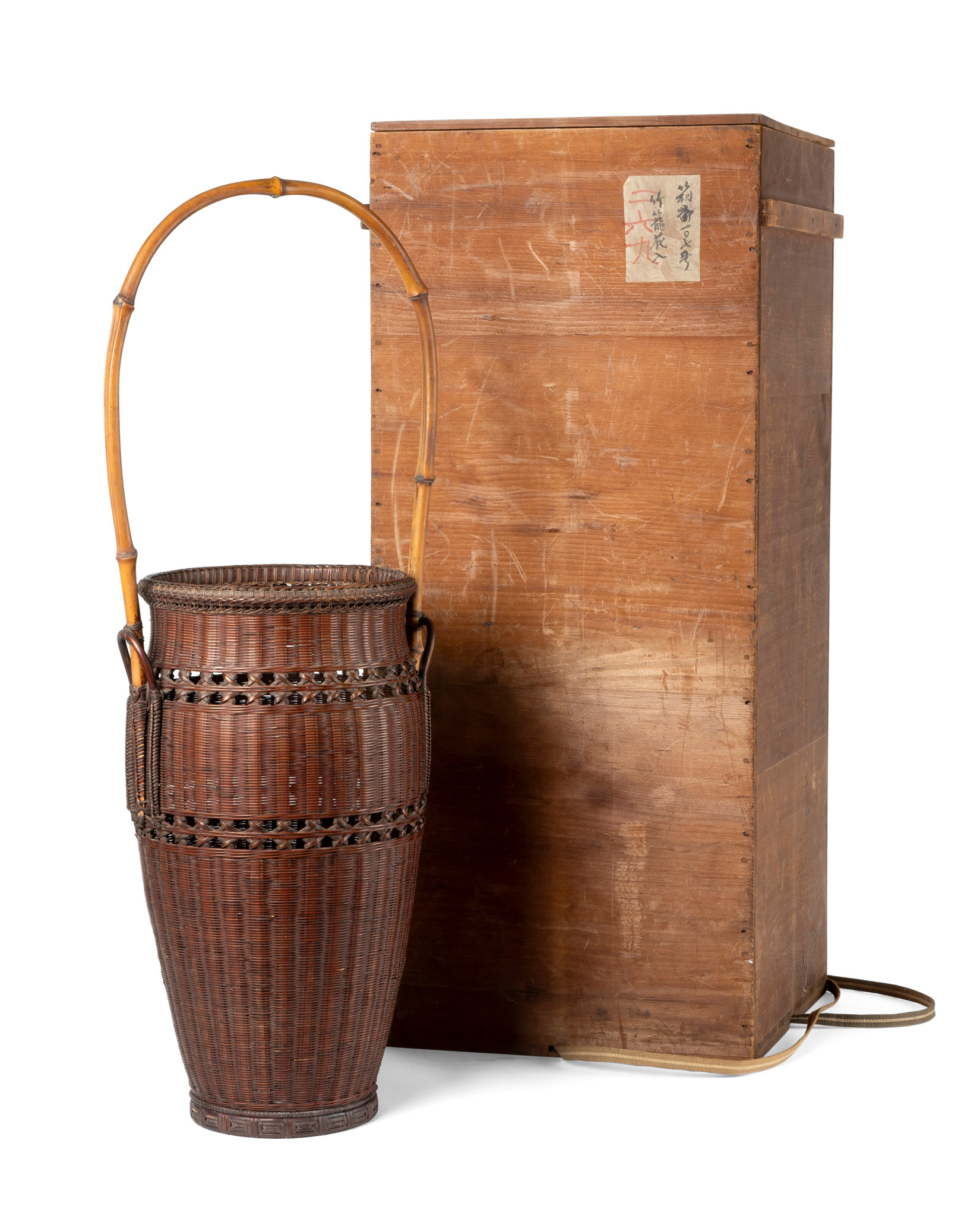 woven with a tall loop handle, the base possibly signed ‘Chikuunsai’, with a wooden tomobako