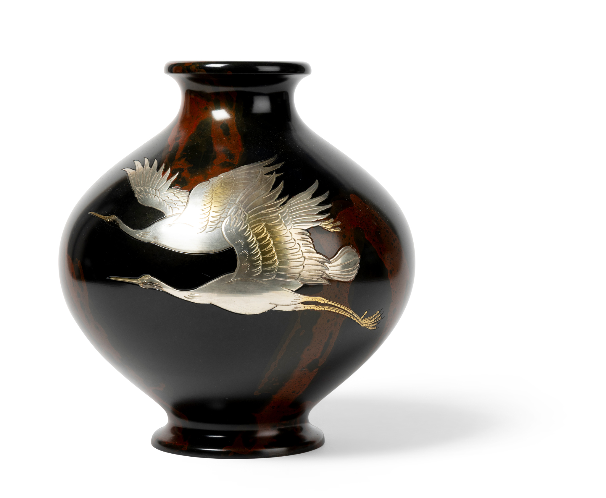 of ovoid form, decorated in silver and gilt with a pair of cranes in flight, the base with an impressed mark ‘Shinmine’