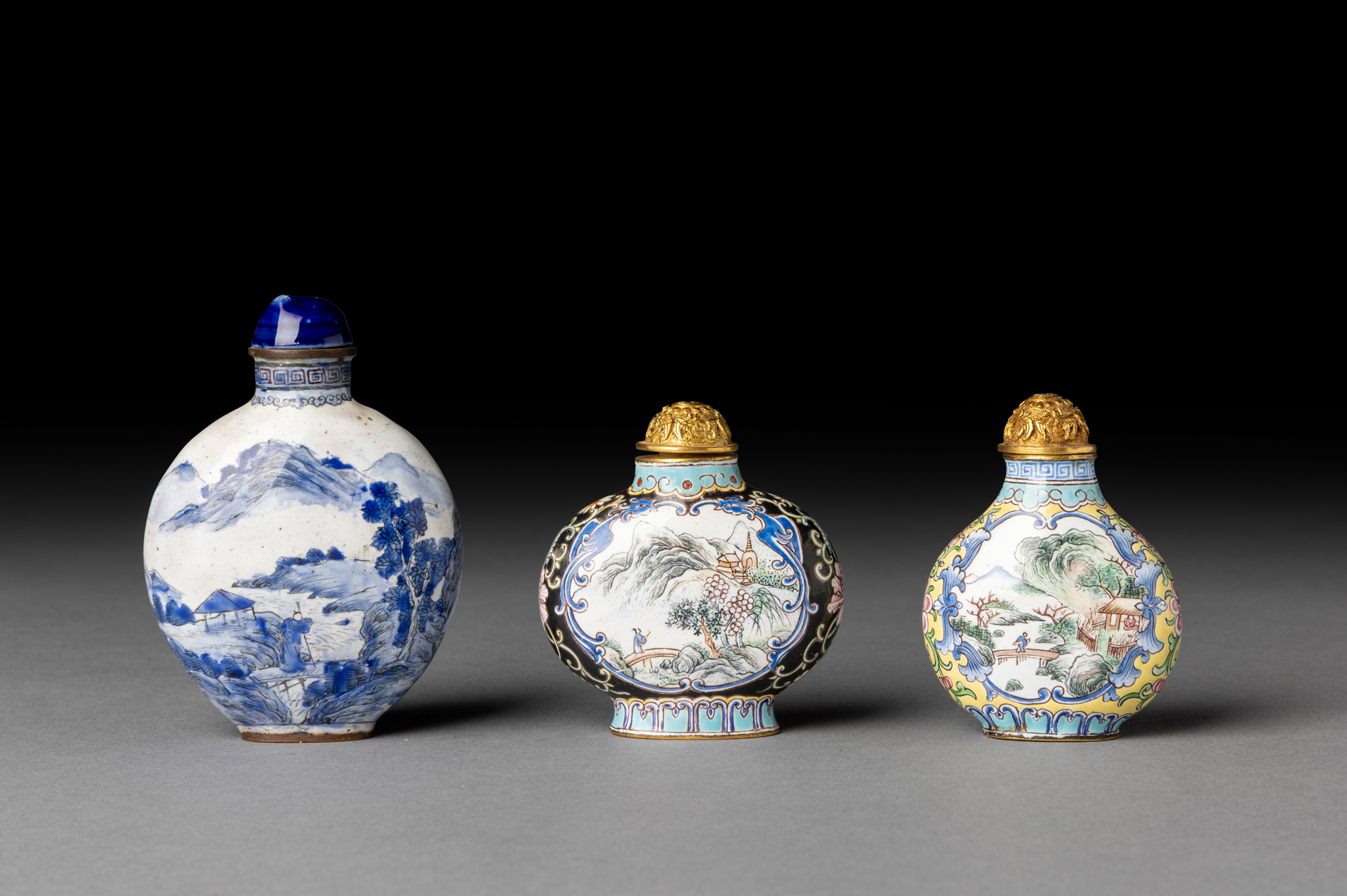 [COLLECTION OF PROF. J. GILBERT & CORA MCALLISTER] GROUP OF THREE CHINESE PAINTED ENAMEL SNUFF BOTTLES