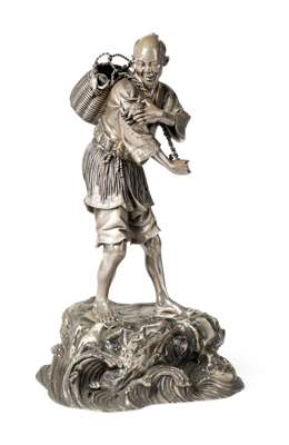 depicting a fisherman removing a large crab off his shoulder, another crustacean escaping to the side of his wicker basket, the man wears a short tunic decorated with waves and a skirt made of sea grass, all raised on a base shaped as a rocky outcrop with further waves crashing to the side, marked to the rock base, possibly for Zuishozo, the foot rim with a stamped yogin (nickle silver) mark